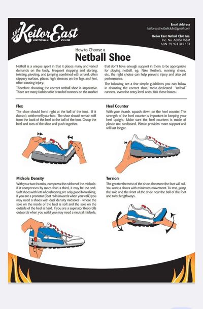 Netball shoes are designed to handle the severe side to side movements players make on the netball court, with features that provide stability and keep the foot on the platform. The width and shape of the outsole differs from running shoes, with a midsole less prone to distortion. The rubber outsole is shaped differently on a netball shoe, going up and over the edge along the midsole, protecting the edge from collapsing when sharp pivot movements are made.